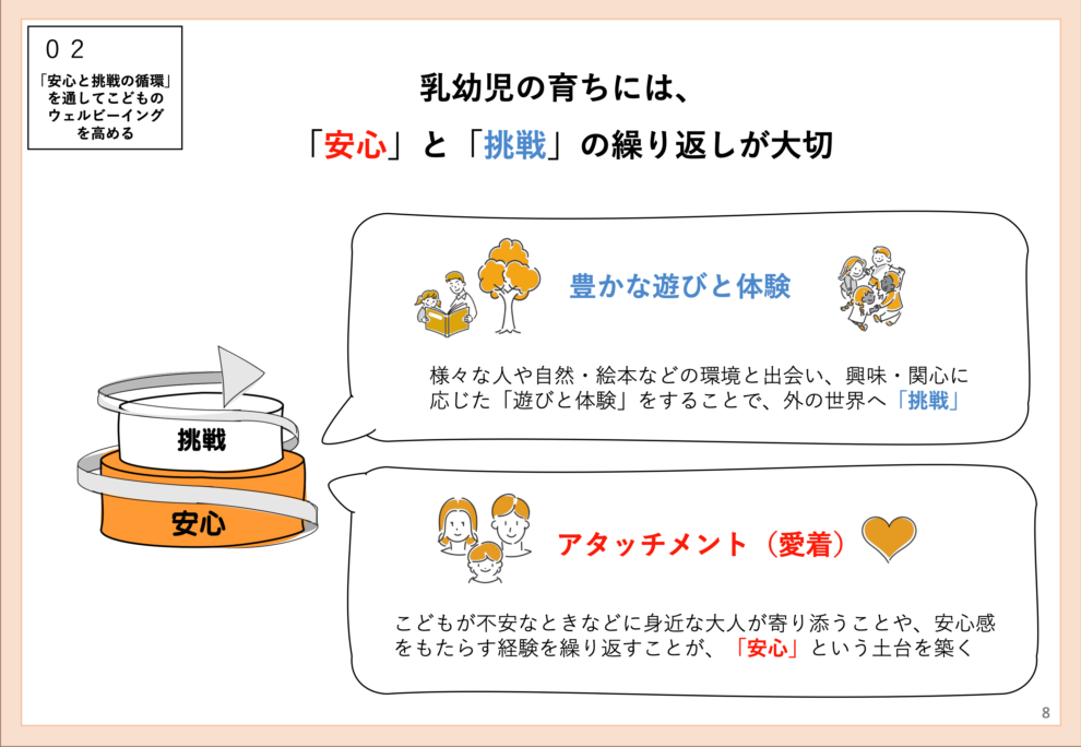 「安心と挑戦の循環」とは、このアタッチメントを通じて、こどもが自ら成長していくプロセスを指します。